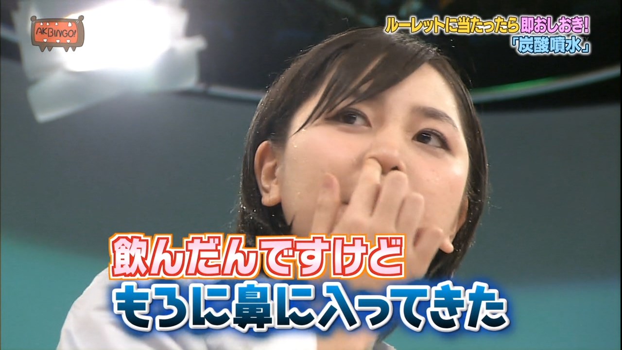 11/26 「AKBINGO!」で岩田華怜が炭酸噴水をして、鼻の穴に指を少し入れる
